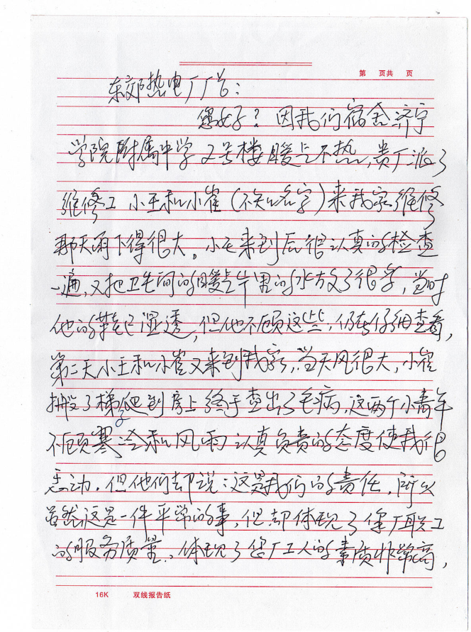 近日,山東聚源熱力公司收到一封來自濟寧學院附屬中學宿舍張老師寫的表揚信,信中這樣寫道:“東郊熱電廠廠長(現(xiàn)為山東聚源熱力)您好,因我們宿舍濟寧學院附屬中學2號樓暖氣不熱,貴廠派了維修工小王和小崔(不知名字)來我家維修。那天雨下得很大,小王來到后很認真的檢查一遍,又把衛(wèi)生間的暖氣片里的水放了很多,當時他的鞋已濕透,但他不顧這些,仍在仔細查看。第二天小王和小崔又來到我家,當天風很大,小崔搬了梯子爬到房上終于查處了毛病,這兩個小青年不顧寒冷和風雨認真負責的態(tài)度,使我很感動,但他們卻說這是我們的責任。雖然這是一件平常的事,但卻體現(xiàn)了您廠職工的服務質(zhì)量,體現(xiàn)了您廠工人的素質(zhì)非常高,也體現(xiàn)了您廠的廠風正,培養(yǎng)了這么好的職工,請領導對他們進行表揚,號召全體職工向他們學習。弘揚正氣,使我們的社會更加和諧?!?/span>