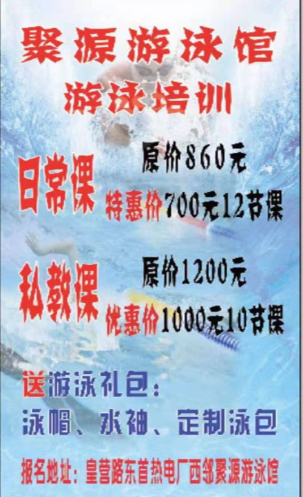聚源游泳館將于2021年3月26日迎春開館,為答謝新老客戶,聚源游泳館開業(yè)之際3月26-4月8日所售游泳卡一律八折優(yōu)惠。開業(yè)前三天3月26日-28日免費游泳啦!敬請廣大朋友相互告知,共赴盛舉。